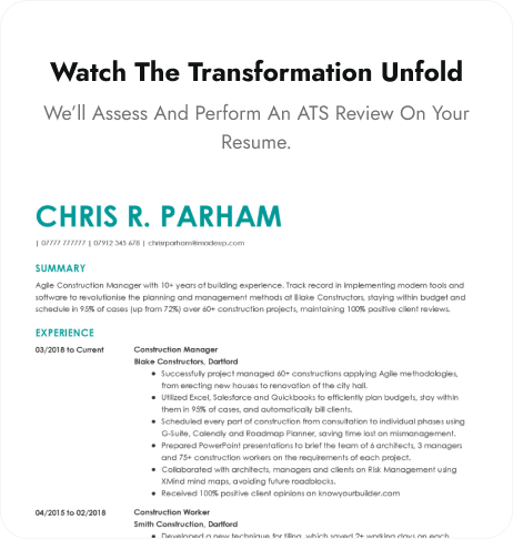 Our free review includes an ATS check to see if the Applicant Tracking System can read your CV. Discover how HR systems view your experience, skills, and industry knowledge, and find out if you're considered a strong match for your target job.